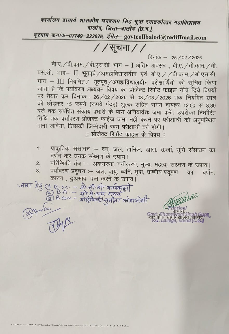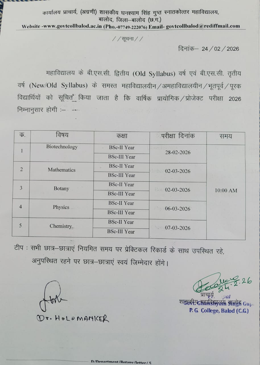 Govt. Ghanshyam Singh Gupt P.G. College Balod cordially welcome you to its website. With the motto, Tam -So-Ma-Jyotirgamaya, the college has successfully completed 30 glorious years of spreading light of knowledge to create a whole new category of intellectually competent, morally upright and socially healthy citizens. Our’s is an aspiring institution dedicated to achieve excellence in the arena of higher education where the future is full of opportunities and promises.