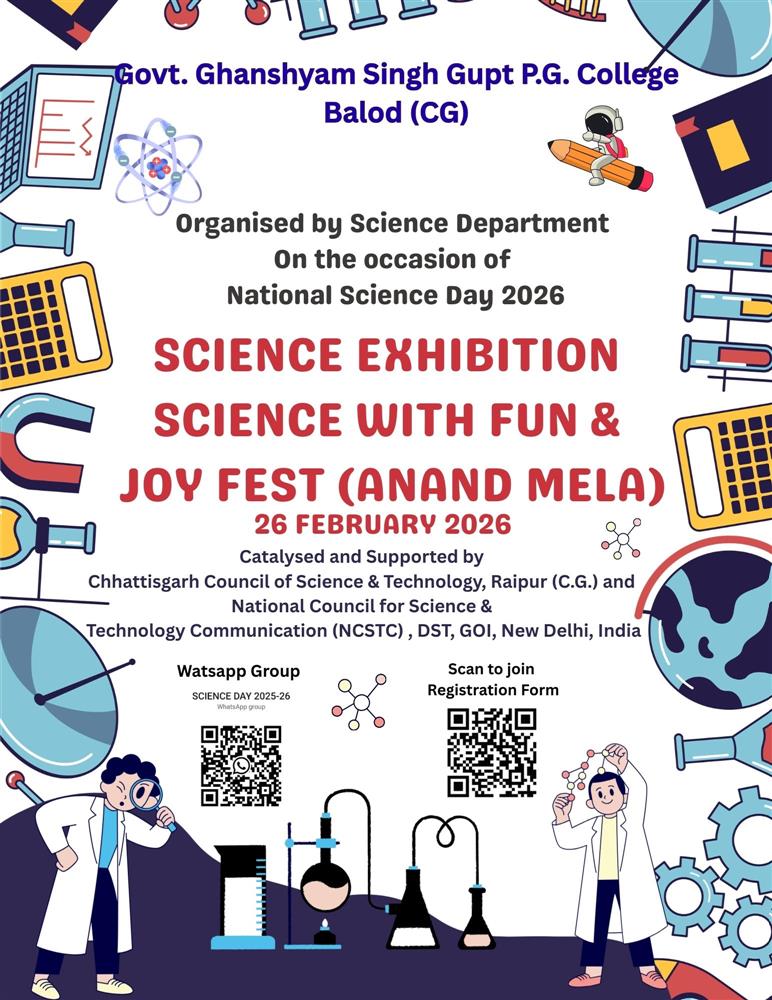 Govt. Ghanshyam Singh Gupt P.G. College Balod cordially welcome you to its website. With the motto, Tam -So-Ma-Jyotirgamaya, the college has successfully completed 30 glorious years of spreading light of knowledge to create a whole new category of intellectually competent, morally upright and socially healthy citizens. Our’s is an aspiring institution dedicated to achieve excellence in the arena of higher education where the future is full of opportunities and promises.