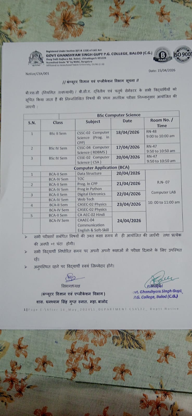 Time Table : First Internal Exam Notice for Computer Science BSc-II Sem Students2025